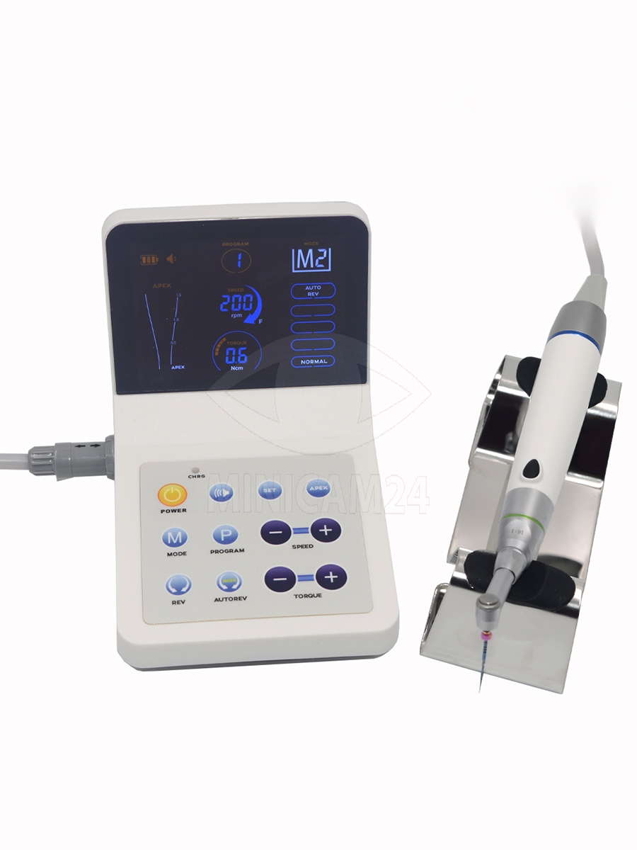 Эндомотор управляется сенсорными элементами и позволяет сохранять до 9 индивидуальных программ. Такое сочетание характеристик делает прибор удобным для точного контроля и настройки параметров при лечении корневых каналов.